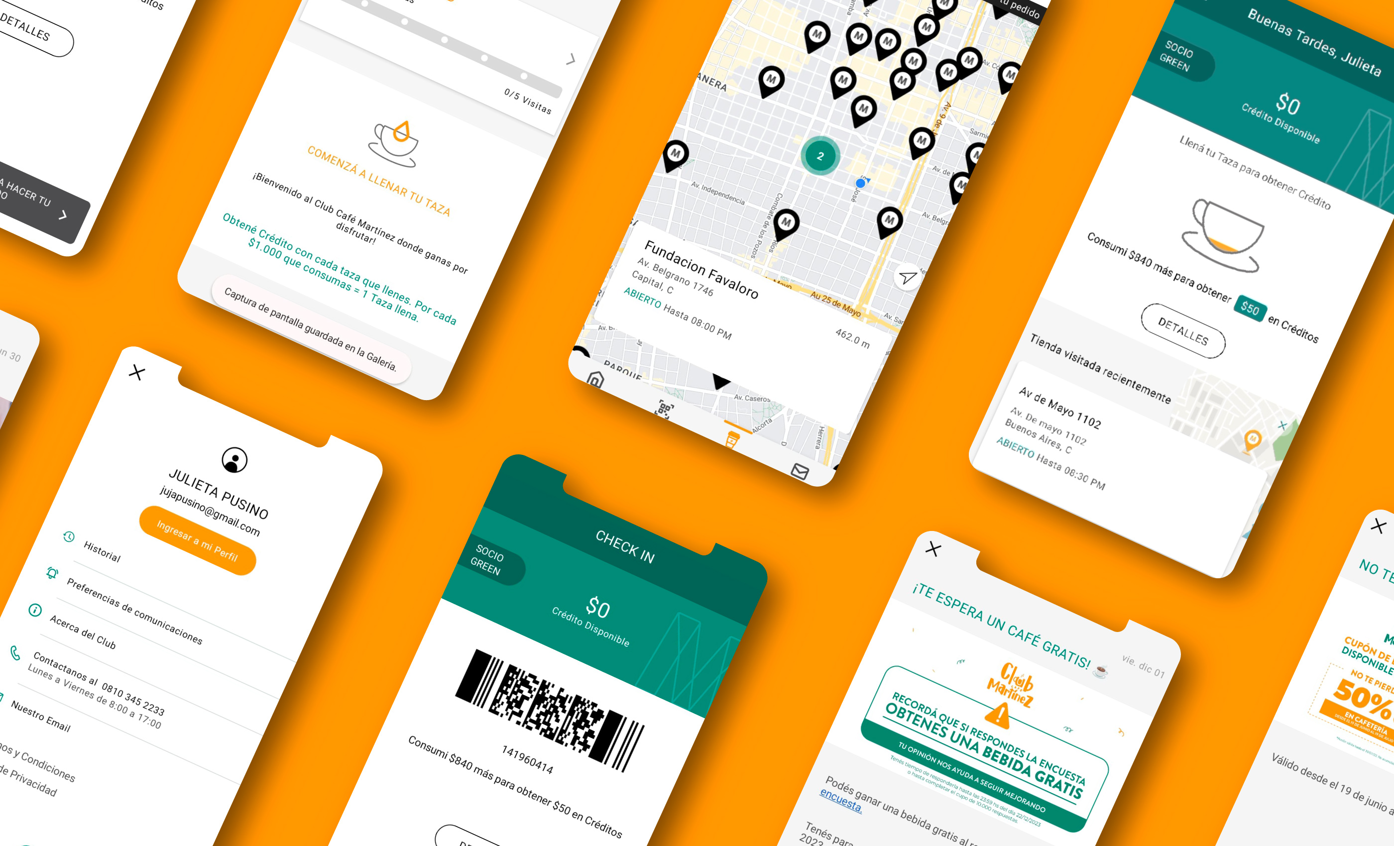 In keeping with the concept of "we add color to coffee" the brand decided to take the next step and develop a "Benefits Club" for all Café Martínez customers. For this project we had the opportunity to develop the naming, the brand identity, the points system, the project strategy and the initial design of the app.